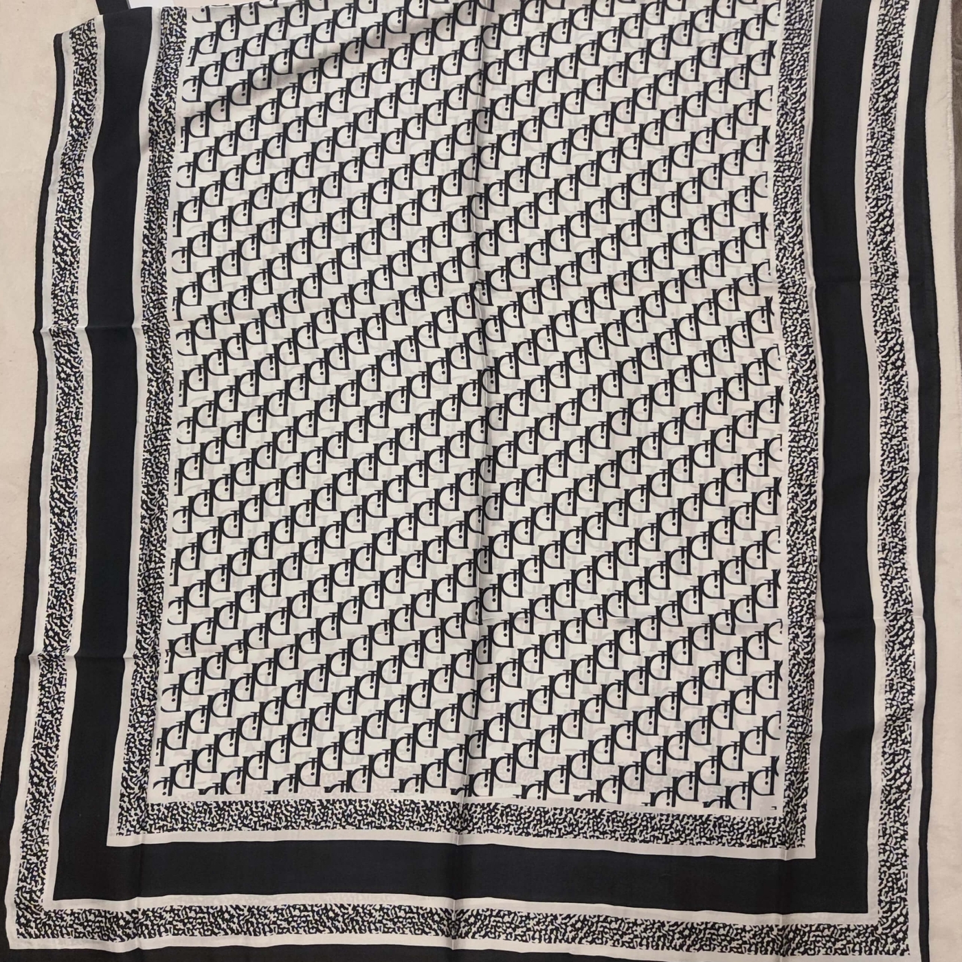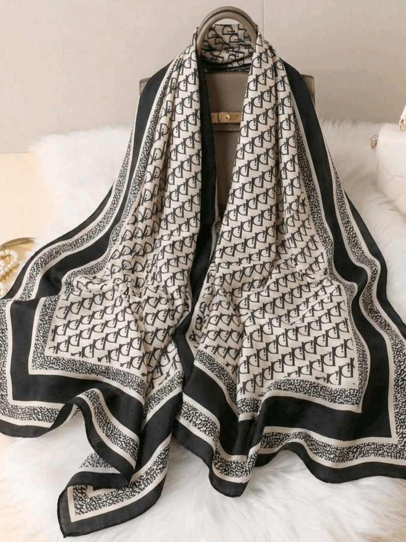 Изтънчен сатенен шал с класически черен монограм принт и деликатен бял контур . Изработен от луксозна смес от естествена коприна и висококачествена вискоза, този голям шал осигурява изключителна мекота и красиво драпиране. Той е перфектният, универсален аксесоар – носете го елегантно около врата, като акцент на палтото си или стилно завързан за дръжката на любимата ви чанта.