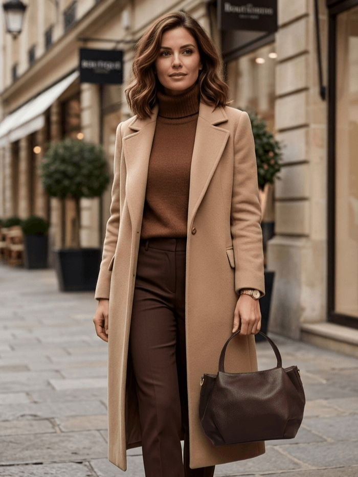 Наситеният тъмнокафяв цвят се комбинира лесно както с класически визии (като стилно бежово палто), така и с небрежни градски аутфити, а златистите метални акценти придават допълнителен лукс на модела.