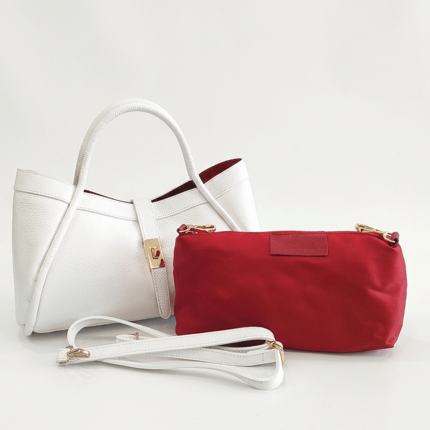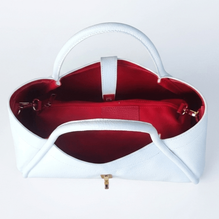 Този модел се отличава с перфектното изпълнение на италианската ръчна изработка и безкомпромисното качество на естествената телешка кожа. Визуалният шок от брилянтното бяло отвън и наситеното червено отвътре превръща тази чанта от обикновен аксесоар в произведение на изкуството. Златистите детайли допълнително подчертават луксозния характер на продукта.